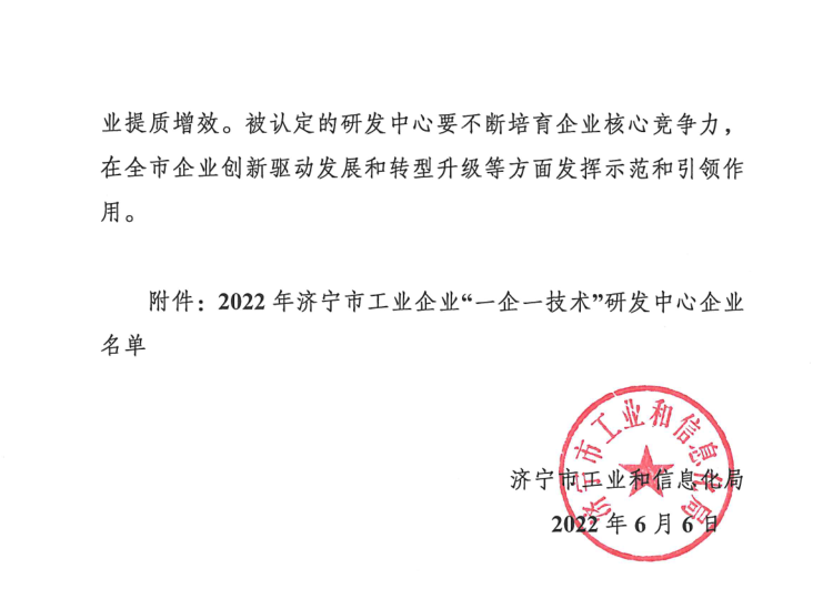 关于公布2022年济宁市工业企业“一企一技术”研发中心企业名单的通知