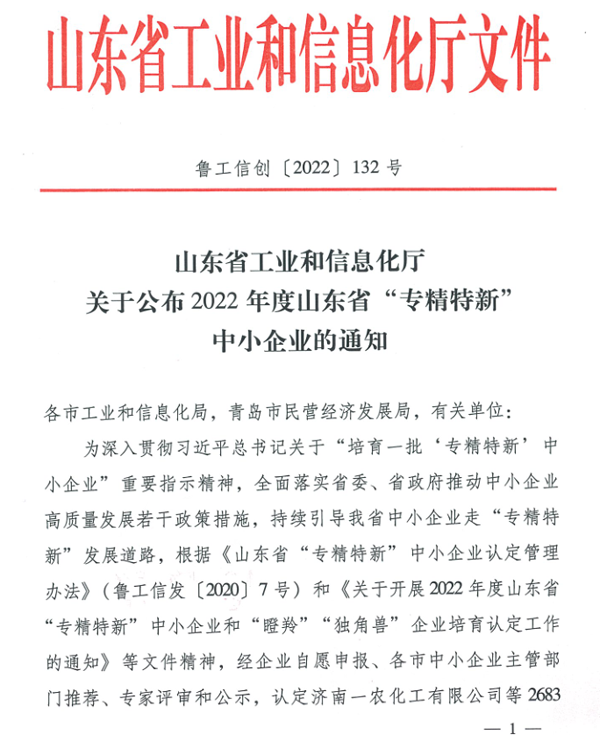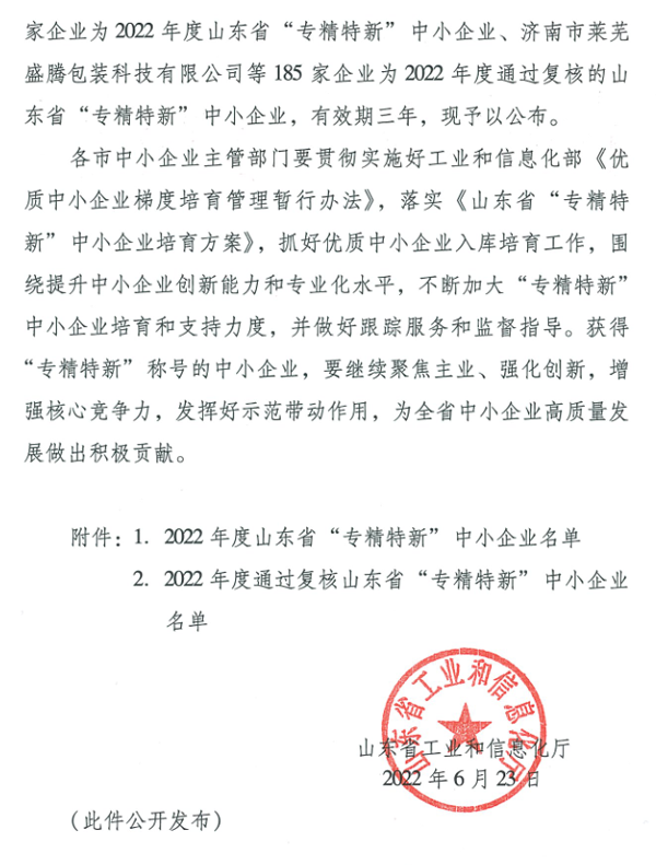 关于公布2022年度山东省“专精特新”中小企业的通知(鲁工信创(2022)132号)